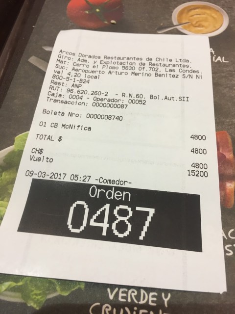 ok ten hour layover in Iquique, Chile airport. whew. two hour flight to Santiago, Chile. severn hour layover here in Santiago airport. One of the nicest airports I have seen. four hour nap in the boarding area waiting for ticket counter to open to get my boarding pass for flight to Puerto Montt, Chile. awakened by passengers and boarding agent. making my way to find ticket counter passed by McD. Found a Sky Airlines desk that printed a boarding pass for me and directed me to Gate 28. Three hours until flight. On my way to Gate 28 I pass McD again. Just could not resist a 5:30 am CB McNifica fries & coca-cola. A mere $4,800 CLP ( unlimited refills ) unlike Europe. Notice I paid with $20,000 CLP bill & the $15,200 CLP change. Check out the BBQ & Club House below.
